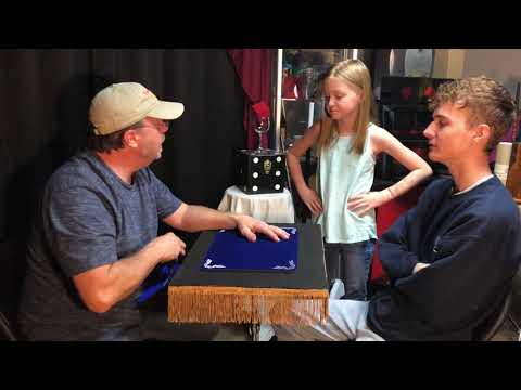 As the excitement builds, the magician reaches into the bag and reveals a chain attached to a gator catcher. The mixed deck is dribbled into the bag, and the gator catcher is lowered inside. After a moment of anticipation, the gator catcher is lifted, revealing the selected card in its mouth!